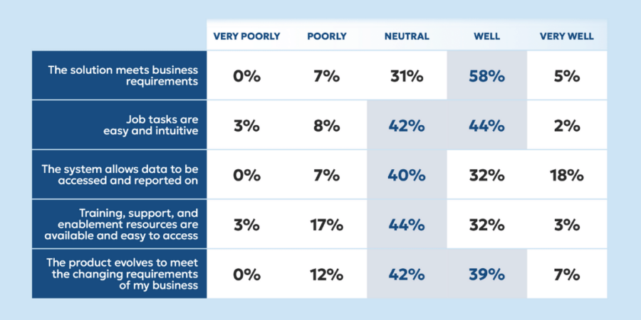 As seen above, the majority of survey respondents believe Infor’s functionality meets desired business requirements, with many describing carrying out job functions as “easy” and “intuitive.” A large percentage of respondents have neutral, or positive feelings regarding data access, training & support, and product evolution as well.