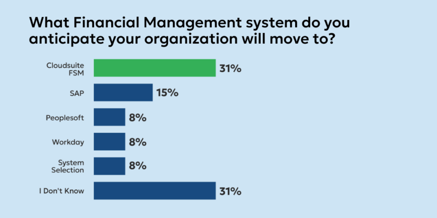 Interestingly, of those respondents using Lawson Financials, nearly a third plan to stay with Infor and migrate to the latest version of CloudSuite FSM. And another third is unsure of what system they will be using for financial and supply chain operations.